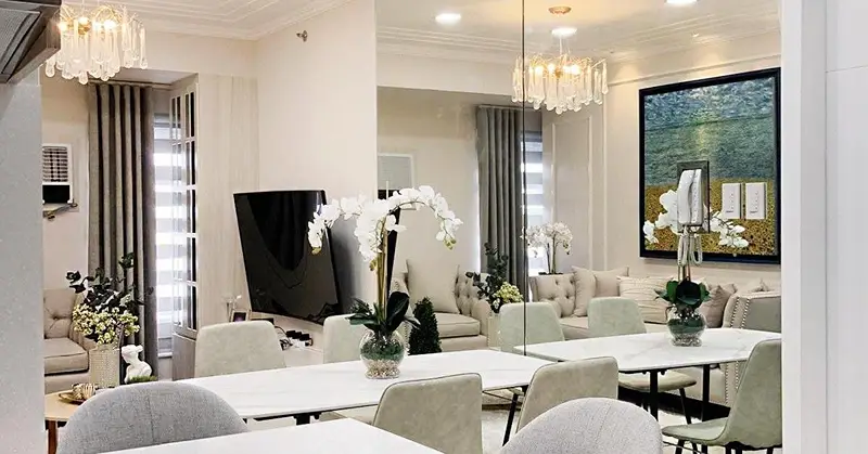 Floor-to-ceiling mirrors are found in the major rooms of this condominium unit, from the living and dining room combo, to the bedrooms. For the sake of discussion, we’ll focus on the shared living and dining space.