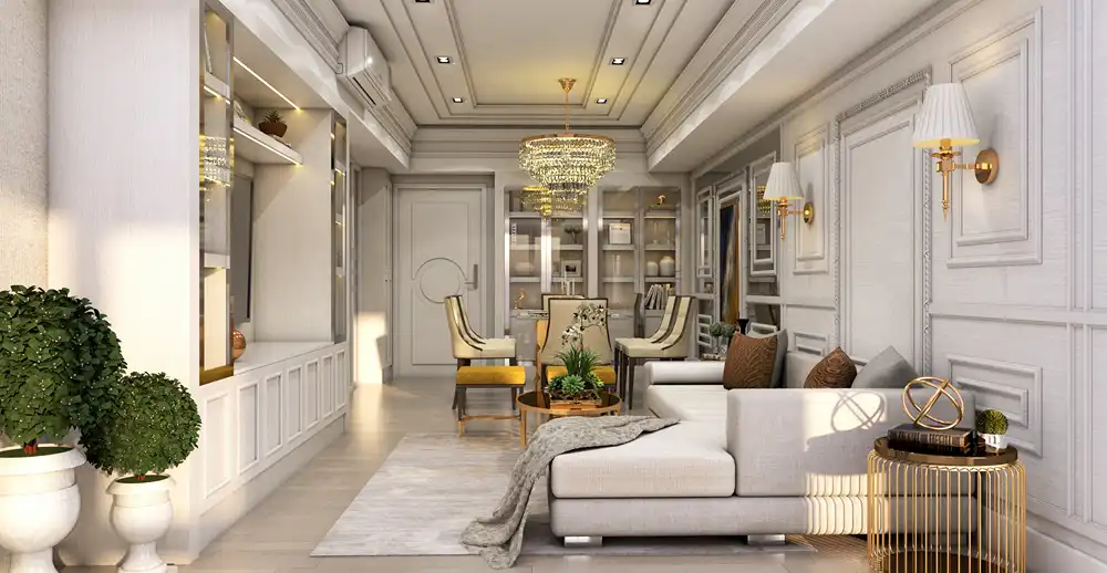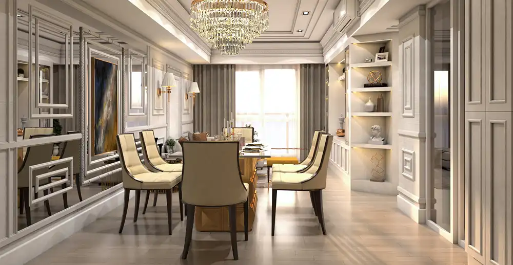 A modern classic condo where exquisite lighting fixtures complement the tasteful use of patterns, embodying timeless elegance. This stylish residence seamlessly blends classic design elements with contemporary accents, creating a space that exudes sophistication and charm. From the stunning lighting arrangements to the carefully curated patterns, every detail reflects a perfect harmony of old-world charm and modern flair. Embrace the epitome of modern living in this meticulously designed urban retreat, where the interplay of lighting and patterns adds a touch of luxury and character to the ambiance.